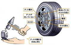 タイヤの亀裂・損傷の有無 タイヤの亀裂・損傷の有無を目で確認するとともにタイヤの異物チェックも入念に行いましょう。 タイヤのかみ込んだ異物をきれいに取り除きましょう。タイヤが片減りしている場合は要注意。整備のプロに相談しましょう。 タイヤの空気圧 タイヤの接地面のたわみ具合を目で見て判断しましょう。接地面のたわみ具合で判断できなければタイヤゲージを使って点検しましょう。タイヤの空気圧が不足している場合は、指定空気圧まで補充しましょう。